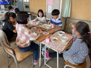 今年度からは、班の形にして向き合って食べます。