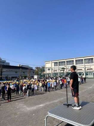 4.6年生の朝会スピーチのトップバッターの2人。自分の好きな野球、音楽のいいところを考えて発表してくれました。全校児童の前で堂々とした姿。素晴らしい。お見事です。