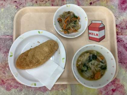 今日は人気のあげパンです。給食のあげパンが初めての1年生は食べてくれるかなと教室を覗いてみると、そんな心配をよそにたくさん食べてくれていました。スープやサラダをおかわりをする子もいて、たくましく感じました。