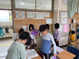 3-1、お互いのノートにどんな学習をしたか興味津々。見合って、学び合っています。