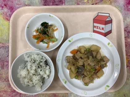 今日は和食の献立です。わかめごはんは食べやすくてお箸がよく進んでいました。煮物やおひたしは好き嫌いが分かれますが、給食室の調理さんが美味しく食べやすくなるよう丁寧に作ってくれました。