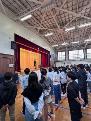 今朝は雨が降っていたので、体育館で全校朝会でした。
