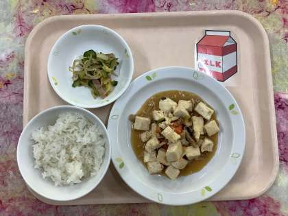 今日は朝から暑くて夏が来たような感じです。暑いと食欲が落ちてしまいそうですが、ジャージャン豆腐はごはんと一緒に食べやすい味付けなので、しっかり食べましょう。牛乳などで水分補給も忘れずにしましょう。