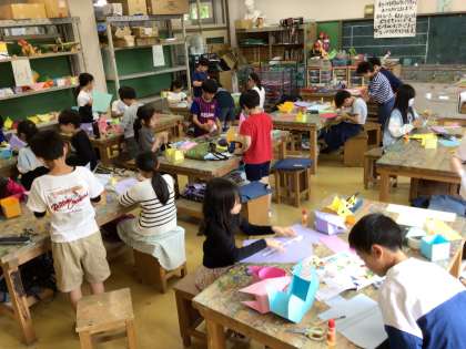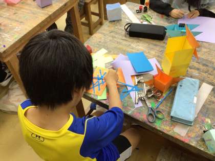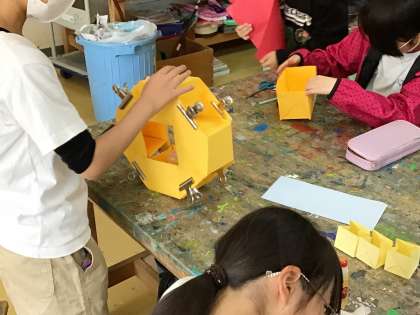 4年生は紙を折り曲げて箱を作り、組み合わせをくふうして面白い小物入れを作りました。