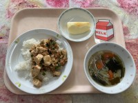 今日は和食です。大豆とじゃこのごはんは、大きな炊飯釜で炊き上がったほかほかのごはんに、炒めた具材を入れてよく混ぜて作ります。大量のご飯と具材を混ぜる作業は結構な力仕事です。こんな影の努力があるので、混ぜごはんが苦手な子もしっかり食べてくれたら嬉しいです。