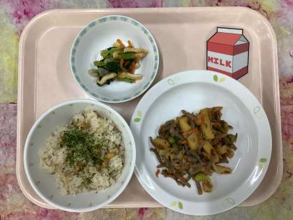 今日は和食です。大豆とじゃこのごはんは、大きな炊飯釜で炊き上がったほかほかのごはんに、炒めた具材を入れてよく混ぜて作ります。大量のご飯と具材を混ぜる作業は結構な力仕事です。こんな影の努力があるので、混ぜごはんが苦手な子もしっかり食べてくれたら嬉しいです。