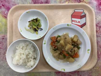 春のじゃがいもは「新じゃがいも」と言われ、とてもみずみずしいです。そんな新じゃがいもを煮物にしました。給食室の大きな回転釜でじっくり調理して、味を染み込ませました。美味しく出来上がったのでぜひ残さず食べましょう。週末は気温が高くなるようなので、水分補給しながら体調を崩さないよう過ごしましょう。