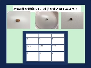 実際に触ったり、長さを測ったりしてタブレットにまとめました。3つの種が何か子供達と答え合わせしてみてください。