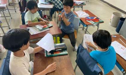 ひらがなの学習では、書くときのポイントはもちろん、習ったひらがなを使った言葉集めも行います。班で言葉を出し合っている写真です。