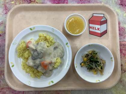 今日はカレー味のごはんにクリームソースをかけて食べる「ドリア風」です。暑い日も食べやすい味付けになっています。サラダをしっかり食べる子も最近よく見かけます。今日は、おまけのみかんゼリーをめぐってジャンケン大会も繰り広げられそうです。しっかり食べて元気に過ごしましょう。