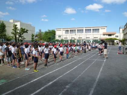運動会まであと3日。今日の音楽集会では、運動会の開閉会式で歌う「運動会の歌(ゴーゴーゴー)」と「校歌」の練習を校庭で行いました。