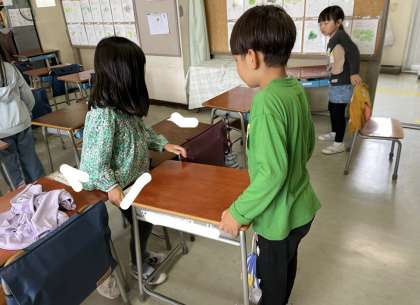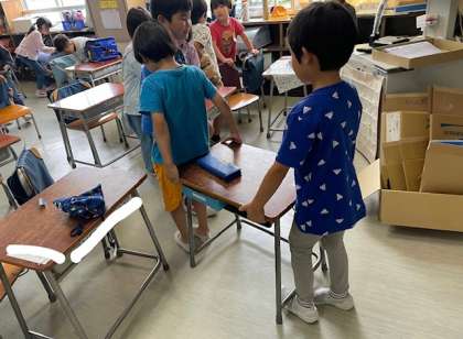 初めての「クラス会議」では、どうやったら、思いやり、すばやく、しずかにを守って机を運べるかみんなで出し合い、実行しました。