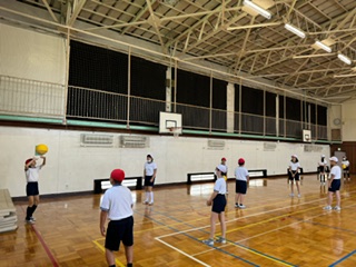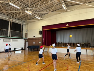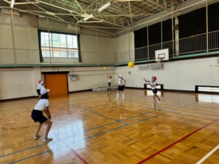 チーム内で、得意な人にコツを教わりながら、トスやアタックの練習をしています。