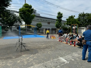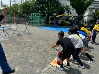 中身は水ですが、実際の消火器を使ってみんなで初期消火体験をしました。