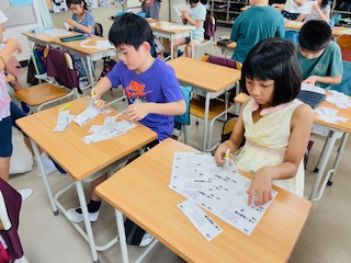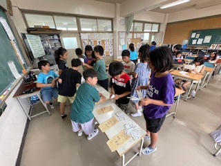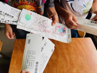 学級のために貢献していたと思う会社に対して、相互に学級内通貨を配り合い、最後に会長(担任)から社長に手渡しました。