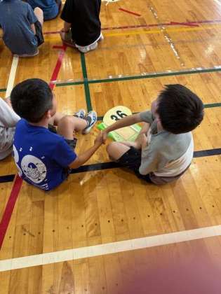 舟形小学校と対面式を終えて握手する山崎と舟形の子。