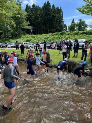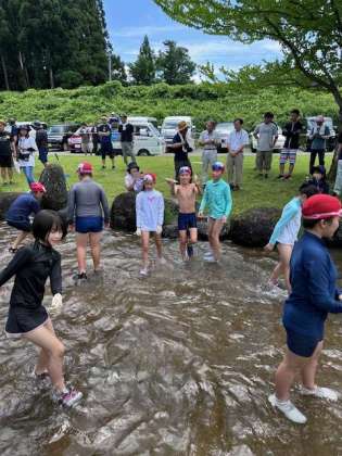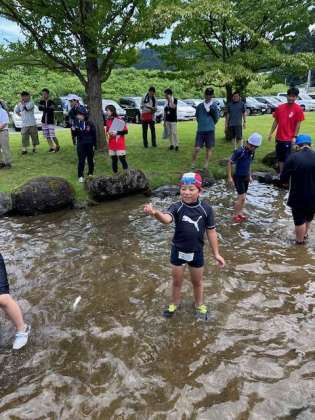 今度は広い池に放流した鮎掴みにチャレンジ。