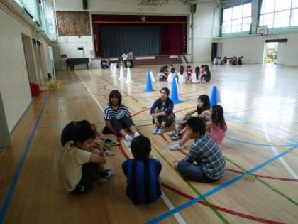 各校が3グループを編成して3つの会場に分かれ、会場に集合してさらに3校混成グループを6グループ編成しました。今回が初めての顔合わせでしたので、自己紹介や並び替えゲーム、ポンポンゲーム、ドッジボール・王様ドッジボールなどを、各グループで、または全員で楽しみました。