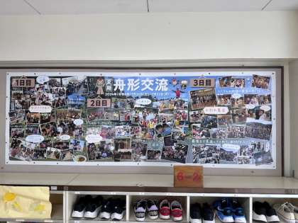 正門から入り、1番近くにある1.6年生の玄関に入ると、6年生の靴箱の上には、今年の夏の舟形交流の様子が!