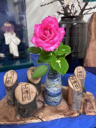 そして、階段に向かうと、美しい薔薇がお出迎え。周りを囲むのは校庭にあった桜の木の枝に山崎小の焼印を押したもの。
