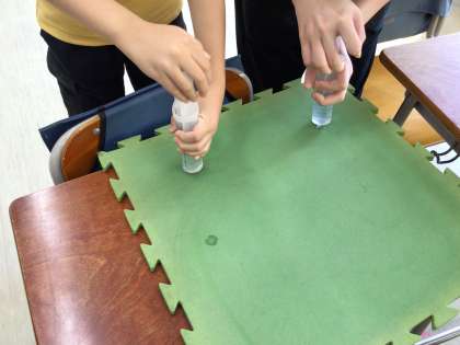 空気の実験の後、同じようなことを水を使ってやってみると・・・全く違う手応えに子どもたちは、驚いていました。楽しみながら、発見することができるように、見守っていきたいと思います。