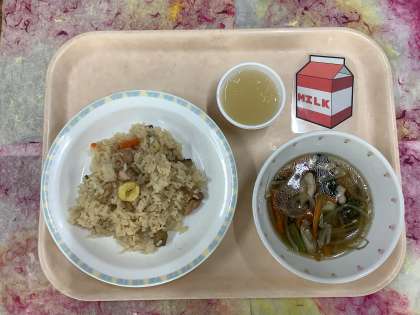 今日は秋の味覚「栗」を使った混ぜごはんです。残りやすい混ぜごはんを食べてくれているだろうかと教室を覗いてみたところ、お代わりをする子どもたちがたくさんいました。みんなのお皿が空っぽになったらとても嬉しいです。秋の美味しい食べものをたくさん食べて元気に過ごしましょう。