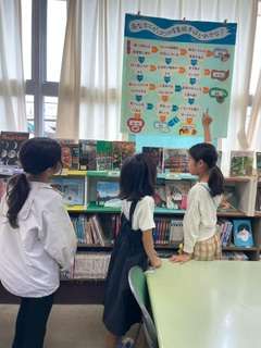 図書室に、自分の読みたい本が見つかるクイズチャートができました。先生に紹介してもらうと、早速やっている子供達が。新しい本に出会う良いきっかけになるといいなと思います。