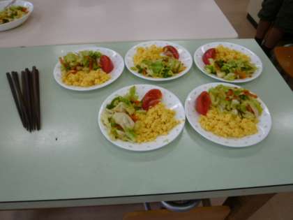 6年生は家庭科の学習で、1組は昨日、2組は今日、「野菜いため」と「スクランブルエッグ」の調理に挑戦しました。