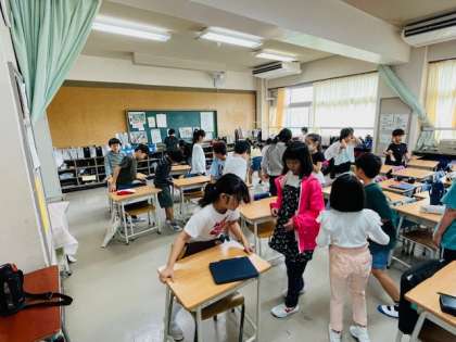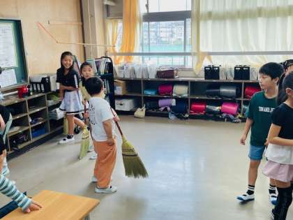 掃除当番メンバーはほうきで掃き進め、他の人たちは机を運びます。