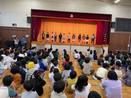 雨だったので体育館での開催でした。しっかり体育座りをして、話す人の目を見て聞く姿勢がお手本になっています!