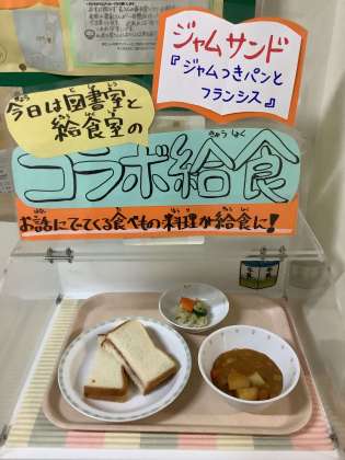今日は図書室と給食室が協力しています。図書室の本に出てくる食べものが給食にも出ます。「ジャムつきパンとフランシス」という本から「ジャムサンド」をみんなで食べます。どんなお話の本なのか、図書室で読んでみてくださいね。