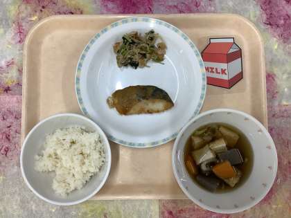 今日はお魚を使った和食献立です。西京みそをベースにしたタレに魚を漬け込んで、オーブンで焼きました。給食室で取ったお出汁を使った「煮びたしや根菜汁」も美味しく出来上がりました。新米のごはんに合う味付けです。食品ロス削減に向けてしっかり食べましょう。