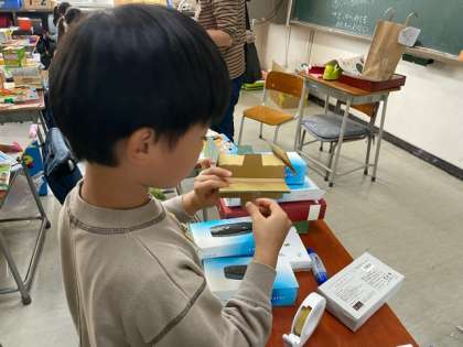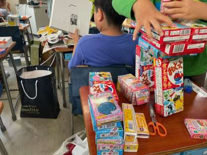 図工「はことはこをくみあわせて」で、たくさんの箱を使って、工作をしました。