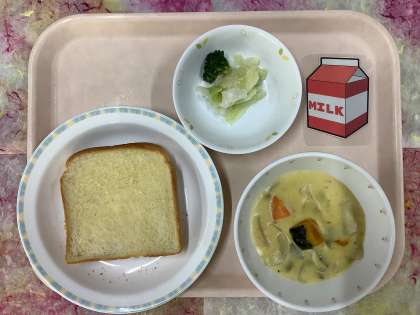 にんにくとバターを食パンに塗って、オーブンで焼いた「ガーリックトースト」や、かぼちゃの入った「パンプキンシチュー」です。1年生の教室を覗いたら「かぼちゃは苦手だけど、このシチューに入っているのは食べられる」ときれいに食べてくれた子がいました。給食で少しずつ食べられるものが増えたら嬉しいです。いろいろな美味しい食べものに出会えるよう給食室も頑張ります。