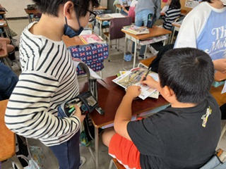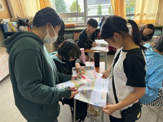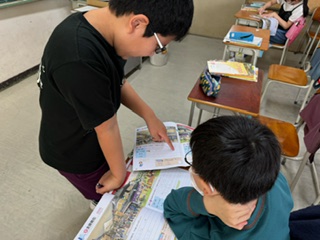 江戸と明治の日本橋の様子を見比べて、人々や街の様子で気が付いたことを交流しています。