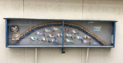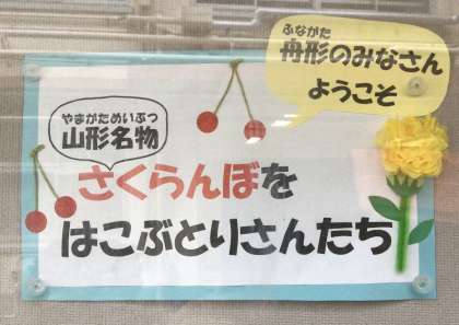 仲よし学級で作成した、山形県の名産「さくらんぼ」をくわえた鳥達が、正門の掲示板で舟形小の友達を待っています。いよいよ秋季舟形交流が始まります。いい交流ができることを願っています。