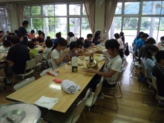 待ちに待った夕食の時間です。カレーライス、サラダ、フルーツです。おいしくいただいています。全員元気です。