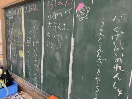 毎朝、班として1日頑張ることを、教室後方の黒板に書いて、帰りの会で振り返っています。