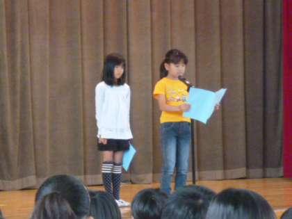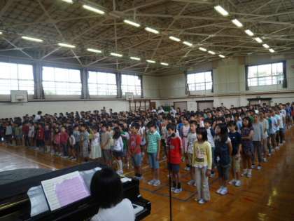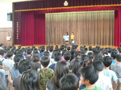 また、3年生の代表児童2名が、1学期を振り返って、夏休みや2学期に向けてを題材に、発表しました。最後に全員で全員で歌いました。