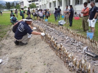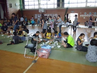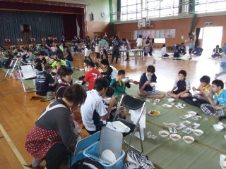 体育館で地区に分かれての昼食会。鮎の塩焼き、芋汁、おにぎりをいただきました。午後の川下りに備えてエネルギーを補給しました。