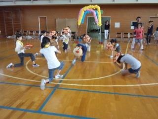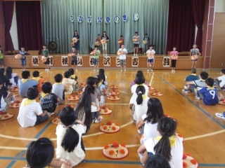 花笠音頭をグループで練習しています。長沢小学校の友達にポイントを丁寧に教えてもらっています。