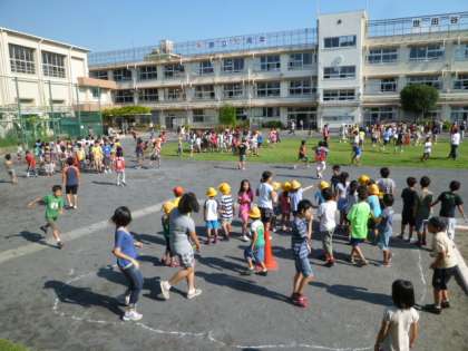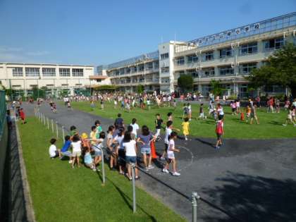 鬼役の集会委員が、安全地帯にいる友達や島を移動する友達を追いかけ、鬼ごっこ・鬼遊びを楽しみました。朝日がまぶしい校庭で、元気いっぱい楽しみました。