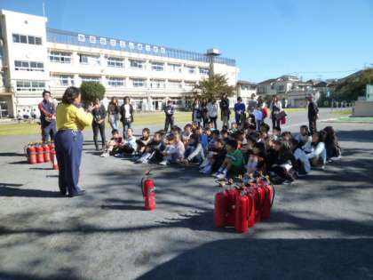 北沢総合支所地域防災担当の方から、消火器の扱いについて話を聞き、火災発生を周囲に知らせる「火事だ!」の発声とともに、消火器をもって移動し、的に向かって消火剤(水)をかける体験を全員がしました。また、参観中の保護者も参加し体験していただきました。