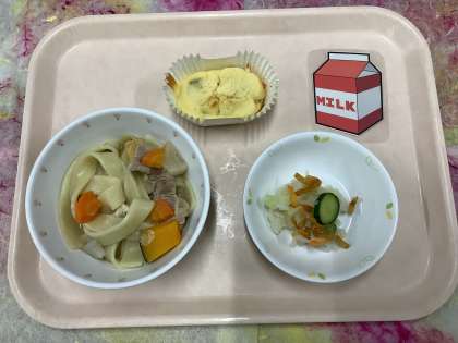 今日は山梨県の郷土料理「ほうとう」です。細長いのが特徴のほうとう麺にかぼちゃ、大根、里芋などの野菜がゴロゴロ入っている味噌味の料理です。パリパリサラダは油で揚げた餃子の皮を野菜の上に乗せていて、子どもたちも食べやすい味付けになっています。そして秋の味覚「さつまいも」が入ったさつまいもケーキも優しい味に仕上がりました。しっかり食べてくださいね。