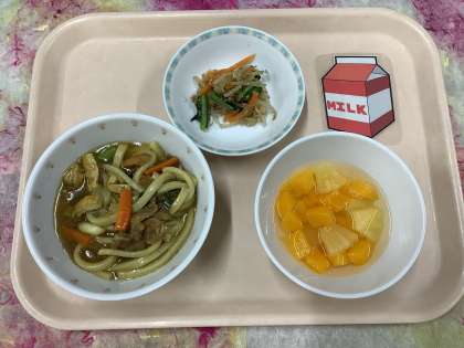 今日も朝から寒くて温かいものが食べたくなる1日です。朝からいい匂いのする給食室では、大きな回転釜からあふれそうなくらいたくさんのカレーうどんが出来上がりました。今週末の学芸会に向けてしっかり食べて元気に過ごしましょう。