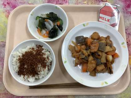 今日は朝からとても寒いです。寒い日こそしっかり食べて体を温めたいものです。「鶏肉とポテトの揚げ煮」は煮物の中に鶏の唐揚げとポテトフライが入っています。給食室では寒い日でも変わらず朝早くから調理しています。煮物や酢の物が得意な子も苦手な子も残さず食べてくれたら嬉しいです。