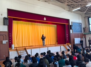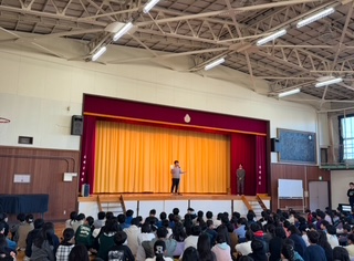 各クラス決勝戦を勝ち抜いた2人が、全校の前で発表しています。
