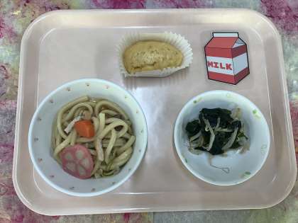 今日は寒い日に食べたい煮込みうどんです。給食室はうどんで使うお出汁の香りが漂い、お蕎麦屋さんに入った時のような気分になりました。胡麻の風味がきいたサラダも美味しく出来上がりました。時間をかけて蒸した蒸しパンも優しい味に仕上がりました。残さず食べてくれたら嬉しいです。