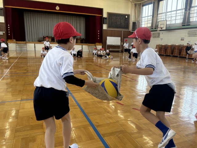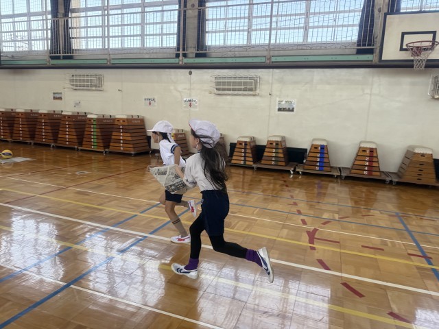 新聞紙から落とさないようにボールを運び、次のペアに交代します。子どもたちの色々な工夫がみられました。