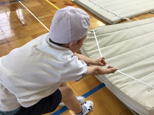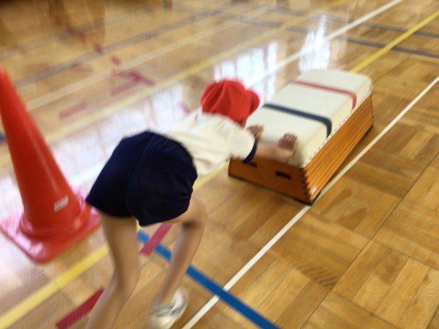 跳び箱を押す「じゃまな岩をどかすぞ!」の運動とマットを引く「恐竜さん、失礼しまーす!」の運動は、地味に力を使い、疲れます。子ども達は、力いっぱい目の前の課題に立ち向かっていました。
